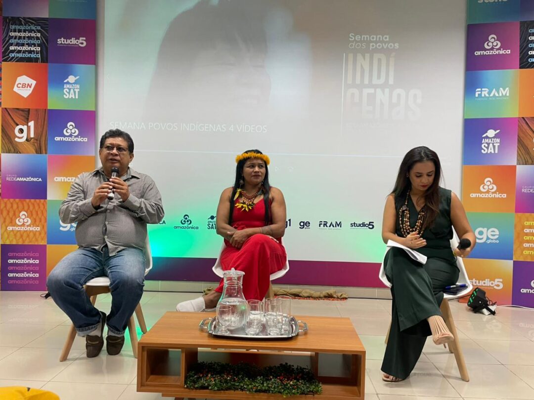 A valorização das vozes indígenas e o fortalecimento de novas lideranças foram o centro da roda de conversa ‘O protagonismo indígena nas telas e em novas lideranças’, debate realizado na sede da Rede Amazônica em Manaus (AM). O encontro aconteceu no dia 24 de abril, em alusão ao mês dos povos indígenas, e reuniu a ativista e liderança indígena Eliza Sateré Mawé, o professor da Ufam Raimundo Nonato Pereira da Silva, e outras representantes indígenas. O evento contou com a mediação da jornalista Ruthiene Bindá.