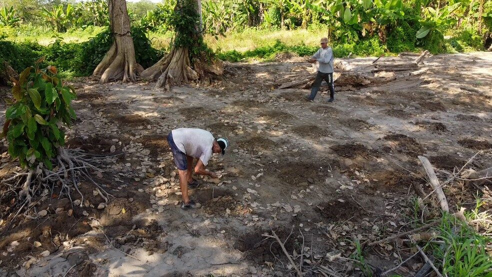 Enquanto a mãe limpa a frente de casa, o agricultor Francisco Maciel e o tio preparam o roçado às margens do rio Solimões para plantar mandioca, principal fonte de renda da família, que agora volta a ser possível com a diminuição das águas.