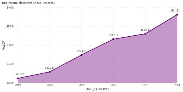 A análise das receitas públicas do Estado do Amazonas revela uma trajetória de crescimento consistente ao longo do período de 2019 a 2024, ainda que em um cenário de intensificação das anomalias climáticas e de desafios socioeconômicos decorrentes da variabilidade ambiental. Conforme apresentado no Gráfico 1, observa-se que as Receitas – Exceto Intra-Orçamentárias – passaram de R$ 21,2 bilhões em 2019 para R$ 38,1 bilhões em 2024, o que representa um crescimento acumulado de aproximadamente 80% em cinco anos.