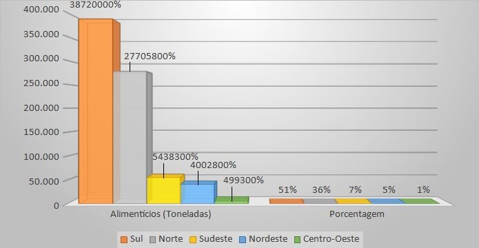 Os dados mais recentes do IBGE (2024) revelam que o Brasil produziu 763.662 toneladas de produtos alimentícios oriundos da extração vegetal, distribuídas de forma bastante desigual entre as grandes regiões do país. A Região Sul ocupa o primeiro lugar, com 387.200 toneladas, o que corresponde a 51% do total nacional, seguida pela Região Norte, com 277.058 toneladas (36%). As demais regiões — Sudeste (7%), Nordeste (5%) e Centro-Oeste (1%) — têm participações bem mais modestas, conforme apresentado na Figura 1.