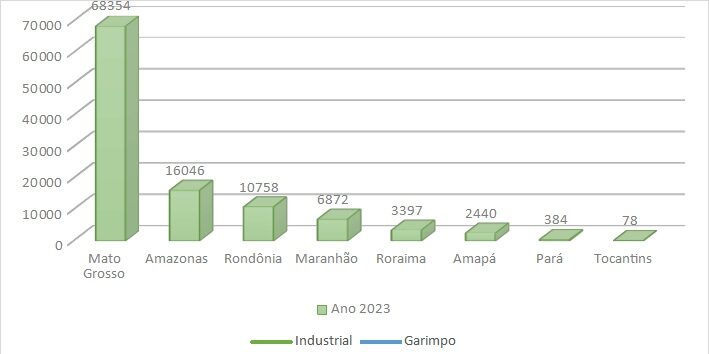 O Gráfico 3 ilustra essas diferenças, destacando a posição de liderança do Mato Grosso e a ampla distância que o separa de estados com menor presença minerária. As posições intermediárias de Amazonas, Maranhão e Amapá reforçam a ideia de que o garimpo se distribui de forma marcadamente desigual pela Amazônia Legal.