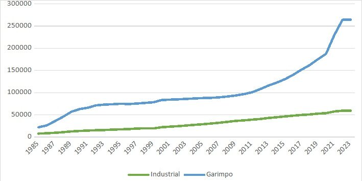 Em contraste, a mineração industrial apresentou crescimento muito mais lento e moderado: passou de aproximadamente 8 mil hectares em 1985 para cerca de 59 mil hectares em 2023. Como resultado, sua proporção relativa diminuiu ao longo do período, representando apenas cerca de 22,5% da área ocupada pelo garimpo no último ano da série.