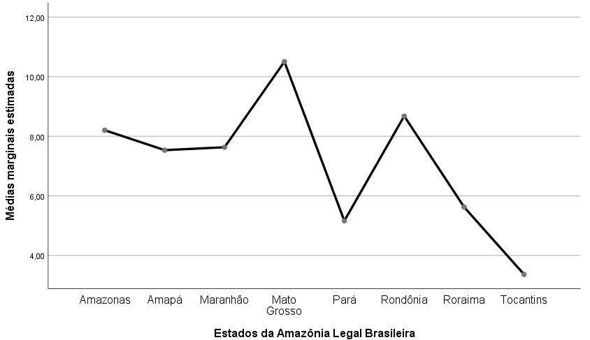 Além disso, observa-se uma forte queda nas médias marginais estimadas para o Pará, seguida de um novo aumento em Rondônia, o que evidencia oscilações significativas entre estados vizinhos e demonstra que a atividade garimpeira não segue um padrão linear na região.