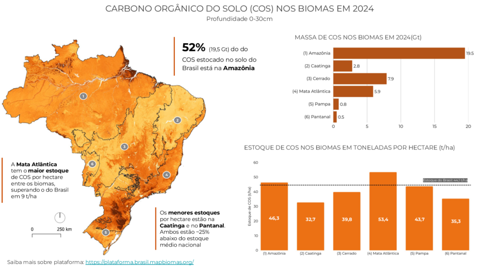 Dos 37,5 gigatoneladas (Gt) de carbono orgânico estocadas no solo do país, 3 Gt estão em áreas agrícolas e 16 Gt em áreas florestais. Em 2024, a Amazônia concentrou 52% de todo o COS estocado no Brasil. A Caatinga e o Pantanal são os biomas que apresentam o menor estoque por hectare (32,7 e 35,3 t/ha, respectivamente).