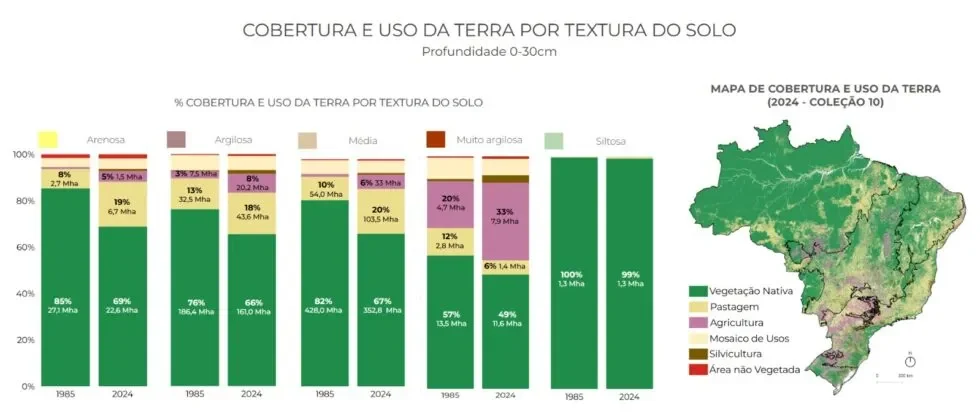 Historicamente solos muito argilosos são os mais utilizados para a agricultura e ocuparam 33% dessa textura em 2024. É a única classe textural de solo onde a agricultura supera a pastagem. Isso é reflexo das condições físicas favoráveis do argiloso para o desenvolvimento de raízes, maior capacidade de armazenamento de nutrientes e maior estabilidade estrutural, reduzindo a erosão e favorecendo o manejo.