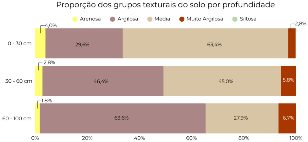 Os resultados mostram que mais da metade do Brasil (63,4%) possui textura média na camada superficial (0–30 cm). Argilosos aparecem em segundo lugar (29,6%), enquanto as texturas arenosa, siltosa e muito argilosa somam apenas 7% do território nacional. A distribuição das texturas varia entre os biomas: na Mata Atlântica, 52% dos superficiais são muito argilosos, uma proporção bem diferente de biomas como Caatinga, Cerrado e Pampa, onde predomina a textura média. Já entre 60 e 100 cm de profundidade, o país torna-se majoritariamente argiloso (63,6%).