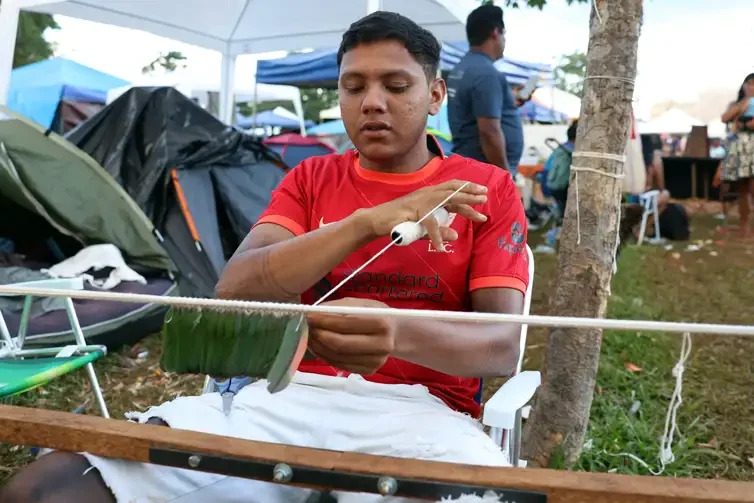 Foi a união do povo Fulni-ô que fez o jovem Aalôa, de 21 anos, que vive também em aldeia na cidade de Águas Belas aprender a fazer o cocar quando tinha 14 anos. Os amigos que o rodeavam no Acampamento Terra Livre disseram que a habilidade do rapaz na produção da arte chama atenção de todos.