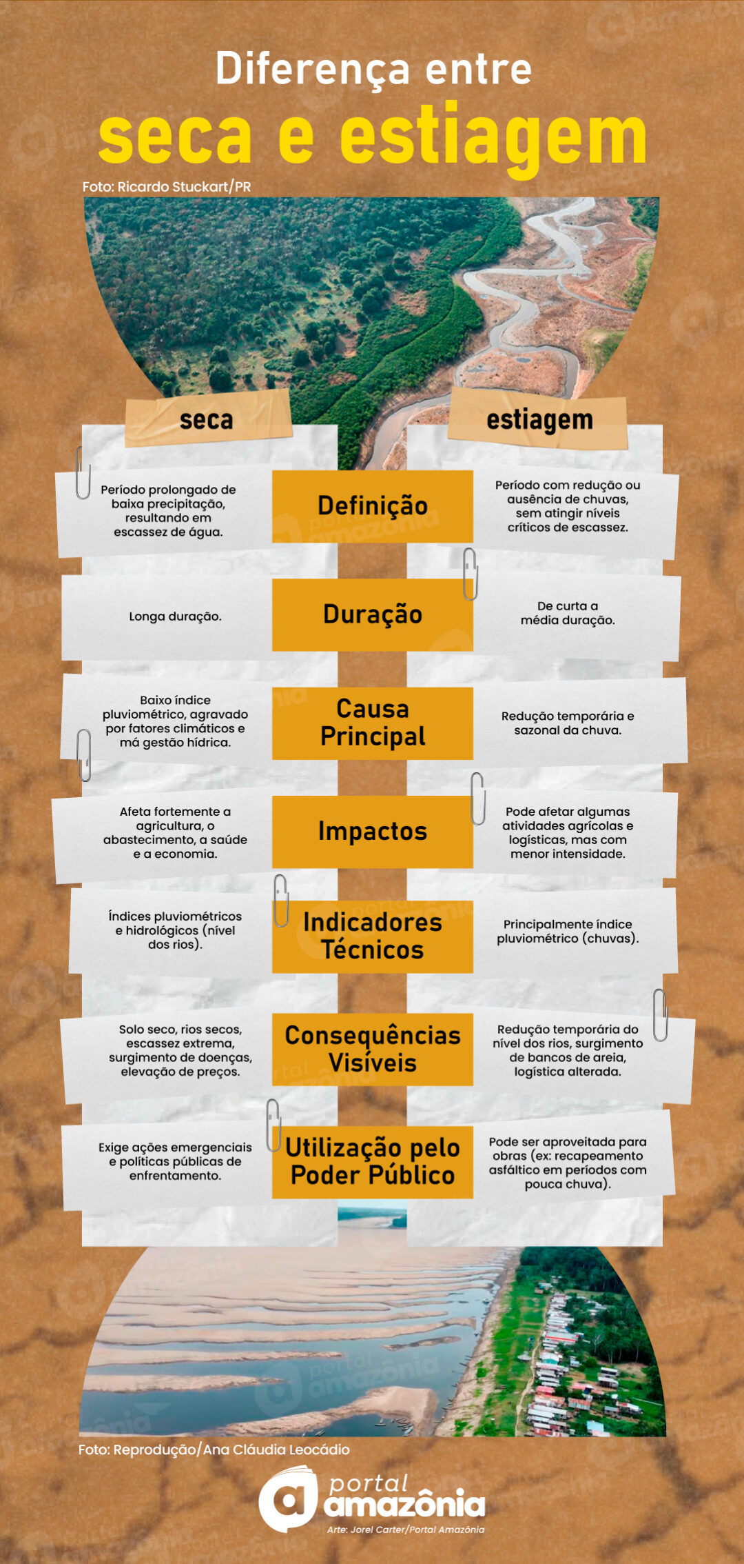 “Basicamente, seca e estiagem têm componentes pluviométricos e hidrológicos. Mas a estiagem é o período em que se observa uma redução nas chuvas, como acontece entre julho e outubro em Manaus. Já a seca é o ápice dessa escassez, com impactos mais amplos, como a dificuldade de acesso a comunidades e aumento dos preços devido à logística comprometida”, declarou o doutor em geografia, Deivison Molinari, ao Portal Amazônia.