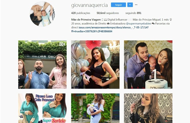 Miguel, o filho de Giovanna, tem apenas um mês de vida, mas a história sua história é conhecida pelos mais de 58 mil seguidores de sua mãe. Segundo a jovem, a ideia de criar uma página sobre gravidez surgiu naturalmente. “Eu comecei a compartilhar a minha gravidez, mostrava roupinhas e a ultrassonografia. Outras meninas foram se identificando, até mesmo que não estava gestante, e queriam saber mais sobre a minha gravidez. Afinal, a maternidade é uma experiência muita linda e muitas tem curiosidade”, disse.