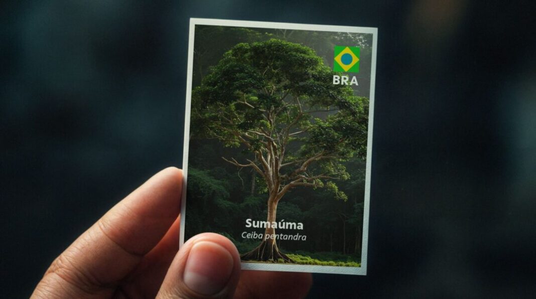 A Amazônia tem destaque na coleção com figurinhas de espécies de árvores icônicas como castanheira-do-pará, babaçu, sumaúma e seringueira.