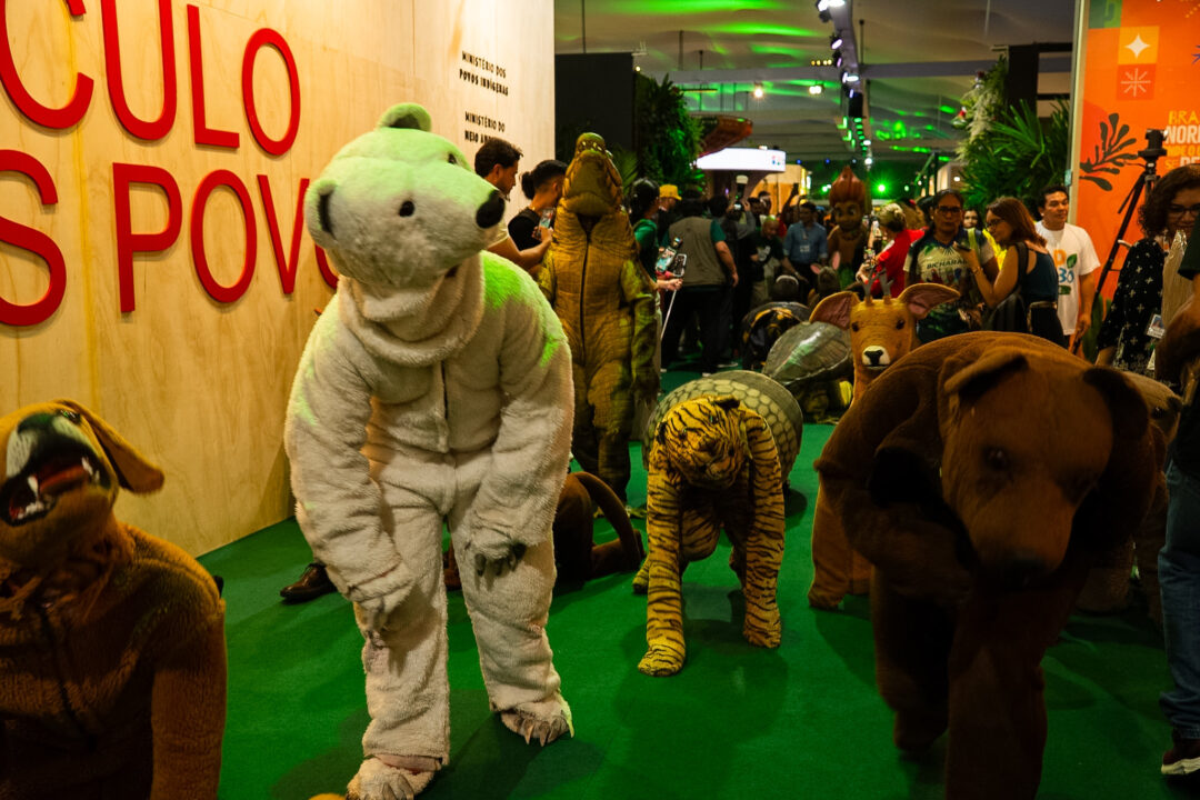 No primeiro dia do evento que reúne lideranças mundiais (10), uma apresentação do Cordão da Bicharada, tradicional desfile de foliões fantasiados de animais que acontece há mais de 50 anos no município paraense de Cametá, foi realizada.