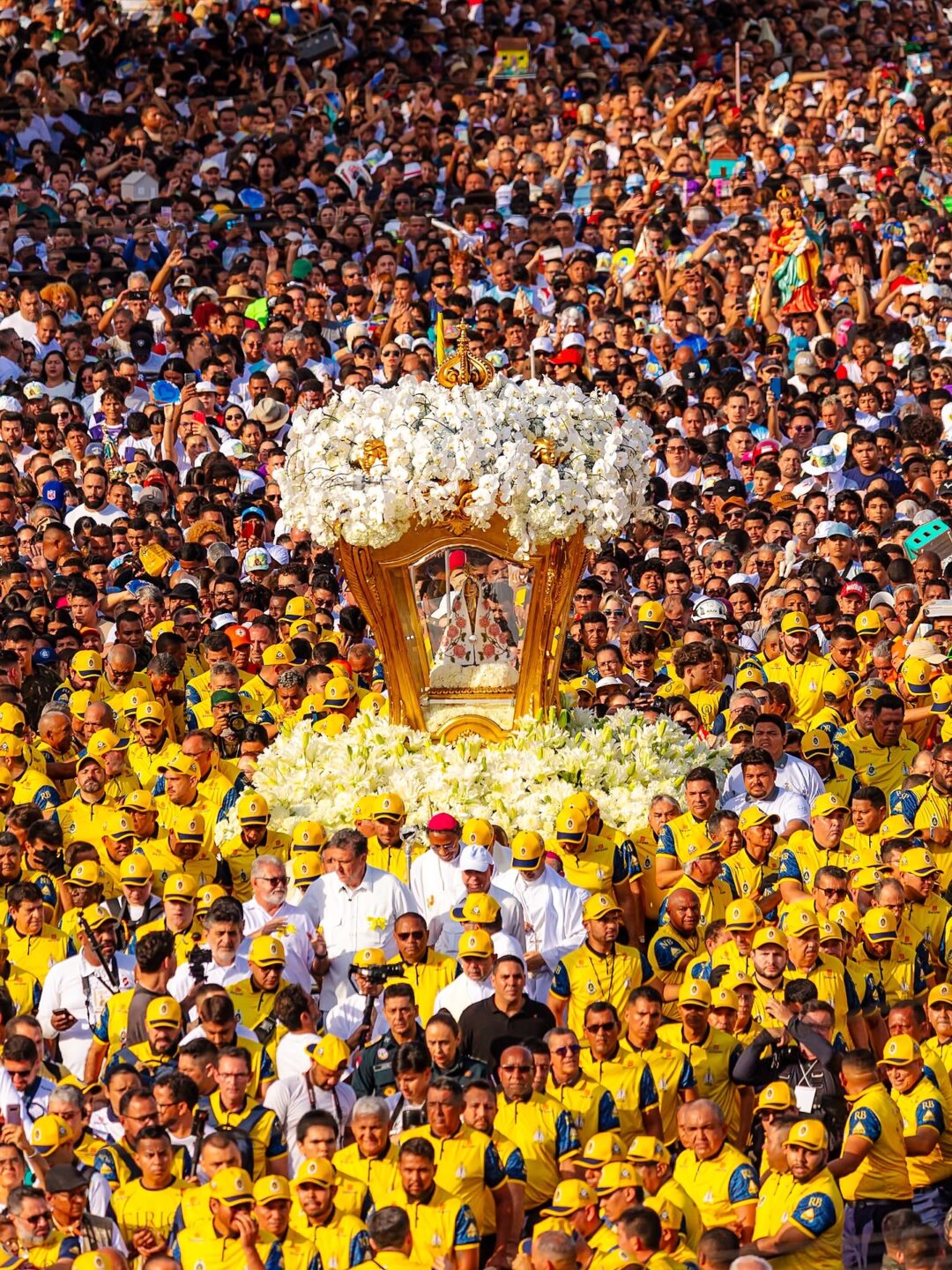 Milhões de fiéis vão às ruas de Belém para participarem das missas, vigílias de oração, do Arraial de Nazaré, do Círio Musical e da descida da imagem do achado para o Altar da Basílica Santuário, onde fica durante os quinze dias da festividade.