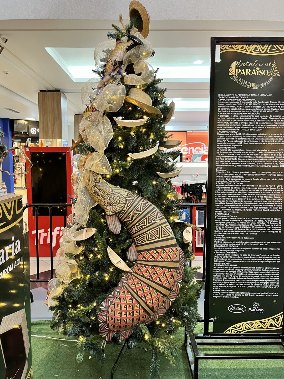 Outras árvores distribuídas pelo espaço incorporam elementos do cotidiano ribeirinho, com trechos de malhadeira utilizados na pesca, organizados de forma a criar o efeito de ondas, peça em madeira representando o pirarucu (peixe abundante nos rios da região), além de pequenas canoas e luzes, reforçando a ligação com a vida às margens dos rios.