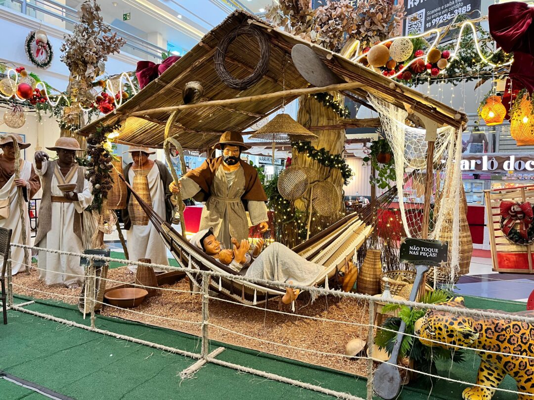 O presépio completa a proposta de forma simbólica: montado num casebre, traz remos apoiados nas laterais e, ao centro, Maria e o Menino Jesus acomodados numa rede, em referência à herança indígena.