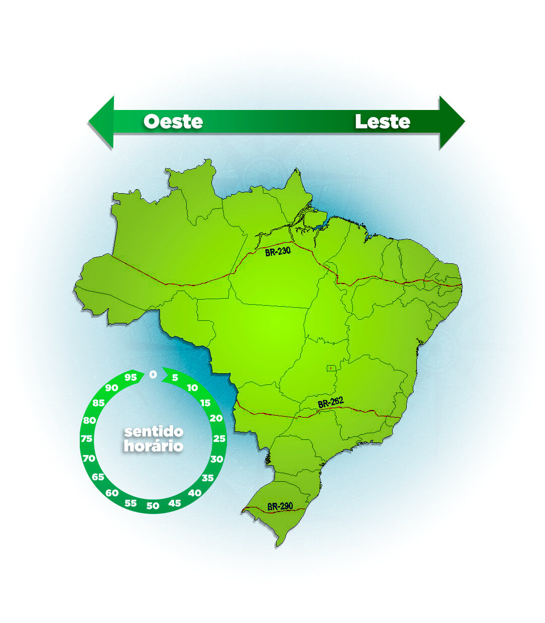 Nas transversais, o sentido vai do leste para o oeste, e nas diagonais, o ponto se inicia mais ao norte da rodovia indo em direção ao ponto maiis ao sul, com exceções das BR-307, BR-364 e BR-392.