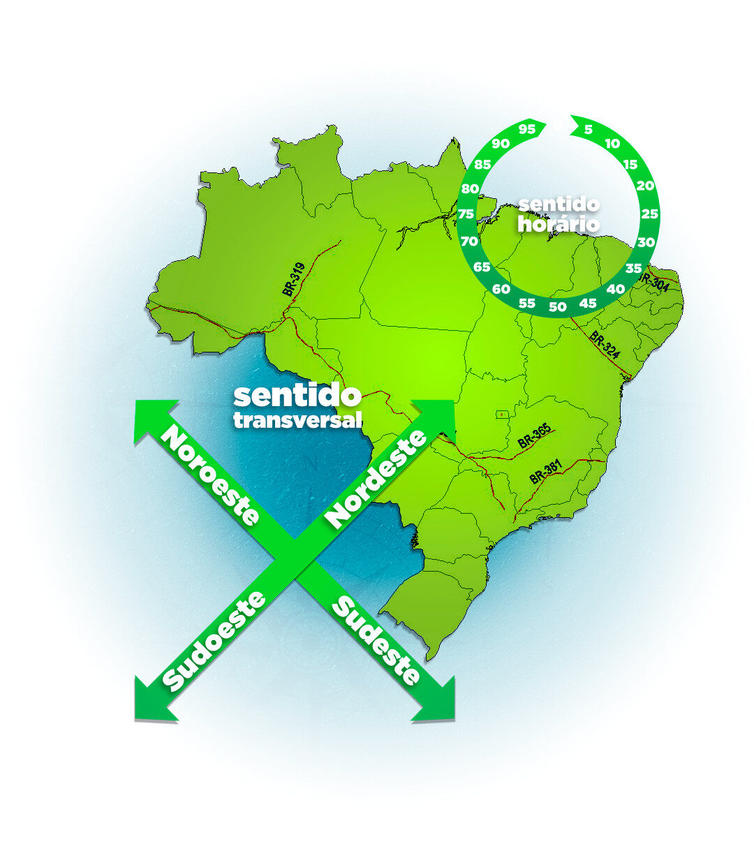 Nas diagonais orientadas na direção geral NO-SE, a numeração varia, em números pares, de 00, no extremo Nordeste do país, a 50, em Brasília, e de 50 a 98, no extremo Sudoeste. Exemplo: BR-304, BR-324, BR-364.