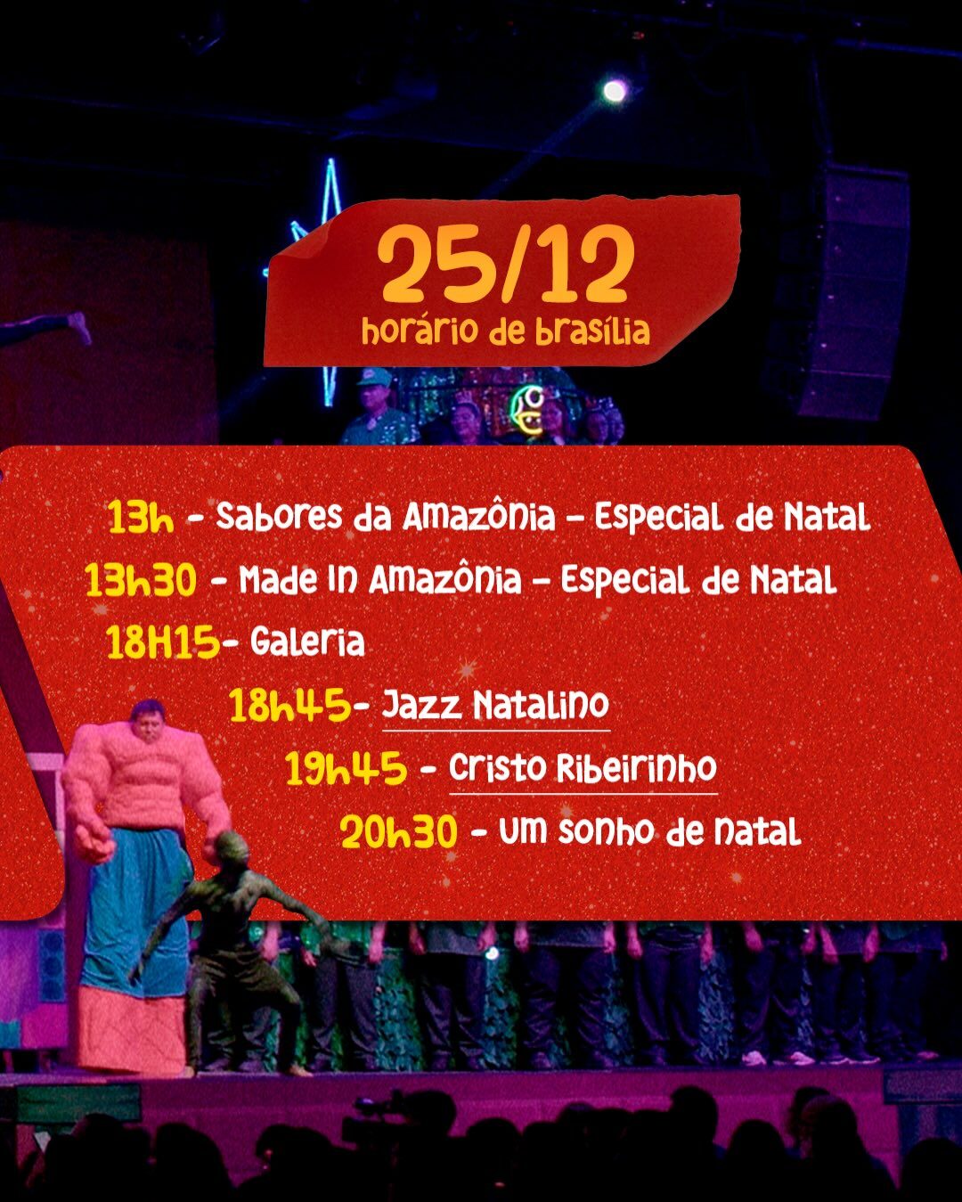 Ou ainda pelo site do Amazon Sat e pelo Portal Amazônia. Veja a programação completa dos dias 24 e 25 de dezembro: