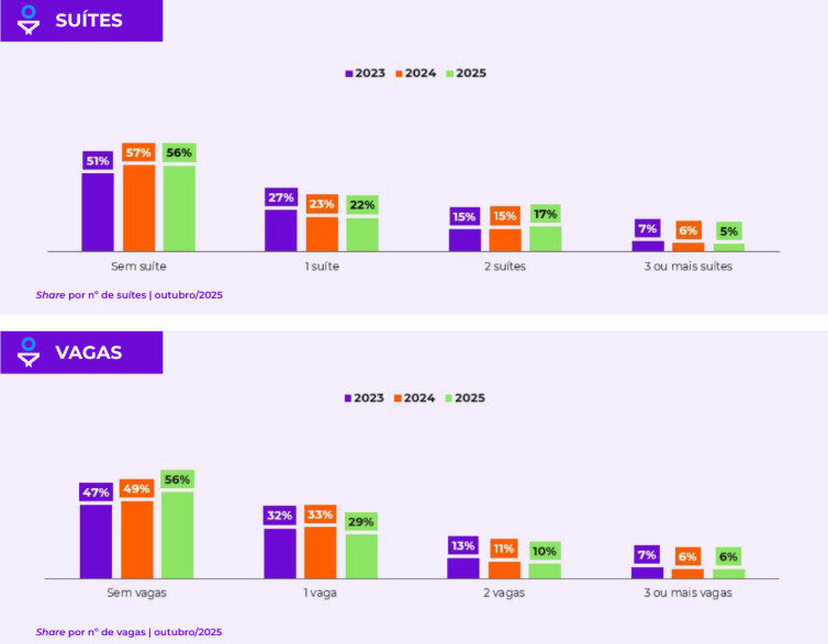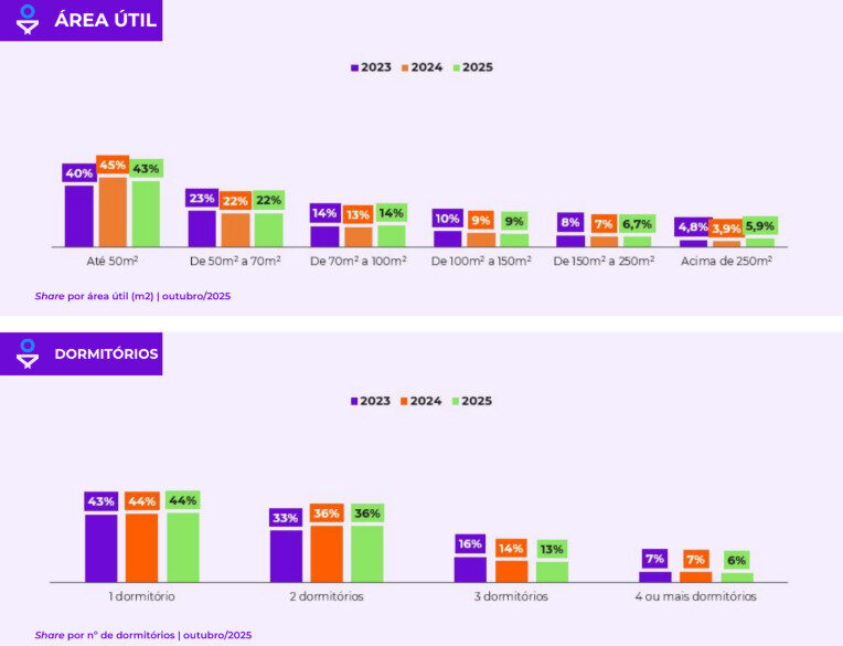 Para locação, o perfil mais buscado é o de unidades também de até 50 m², com um dormitório, sem suíte e sem vaga de garagem, indicando maior interesse por imóveis compactos e acessíveis.
