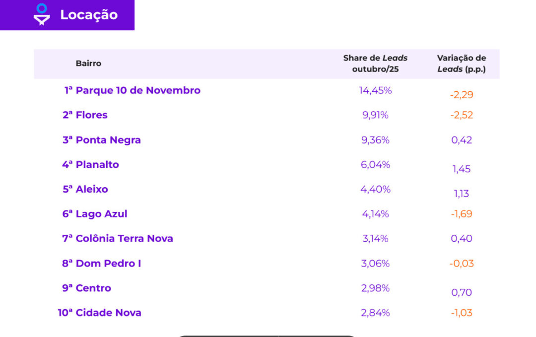 No mercado de venda, Ponta Negra lidera as buscas na cidade e respondeu por 13,24% dos leads gerados ao longo dos últimos 12 meses até outubro de 2025. Na sequência, aparecem Parque 10 de Novembro (10,08%) e Flores (8,62%), que juntos representam cerca de 32% de toda a procura por compra de imóveis em Manaus.