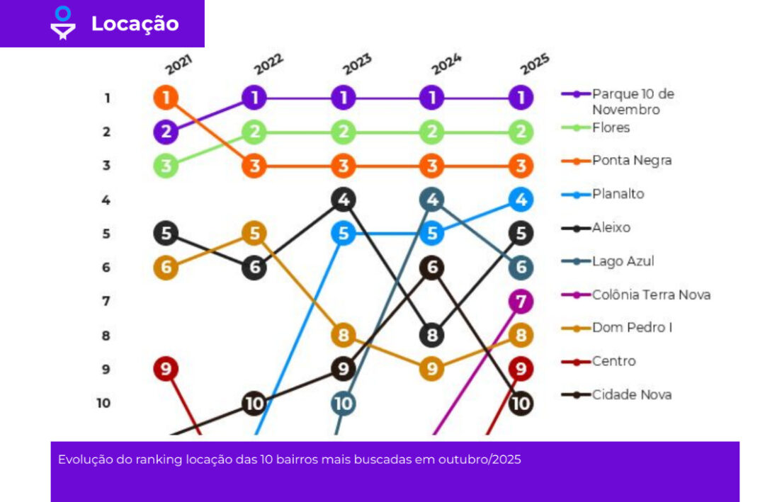 No mercado de locação, o ranking é liderado pelo Parque 10 de Novembro, responsável por 14,45% da demanda, seguido de Flores (9,91%) e Ponta Negra (9,36%). As três regiões representam 34% de todas as buscas por aluguel em Manaus. Entre os bairros com maior crescimento relativo na procura por imóveis para locação, o destaque é o Planalto, que avançou 1,45 p.p. no período analisado.