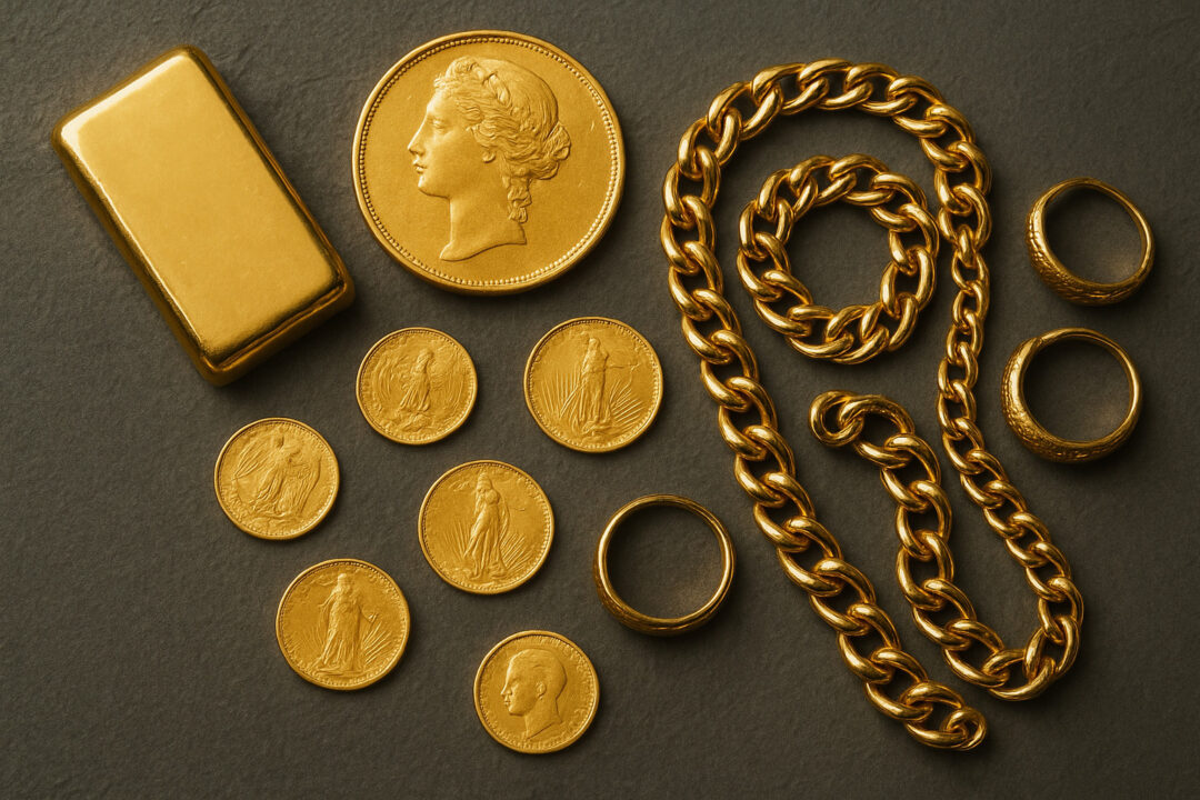 Pós de ouro, bulhão dourado, ouro em barras, fios e perfis de seção maciça, metais comuns ou prata, folheados ou chapeados de ouro, desperdícios ou resíduos de folheados/chapeados de ouro e platina, cinzas que contenham ouro ou platina (mas que não contenham outros metais preciosos) e outras moedas são alguns dos insumos desta categoria.