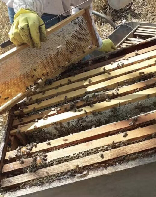 Durante o trabalho, Lucas manuseia cuidadosamente as molduras de cera onde o mel é armazenado e acompanha o comportamento das abelhas para garantir uma coleta segura. O processo exige paciência e tranquilidade, pois qualquer movimento brusco pode agitar as abelhas e comprometer o trabalho. “É preciso respeitar o ritmo delas”, explica Lucas.