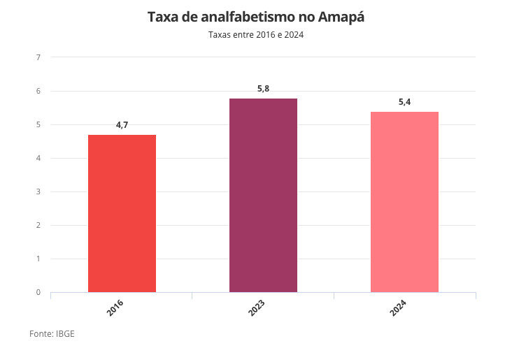 O Amapá tinha 37 mil pessoas com 15 anos ou mais de idade analfabetas, o que correspondia a uma taxa de analfabetismo de 5,4% – a segunda maior taxa da série histórica iniciada em 2016. Os dados da Pesquisa Nacional por Amostra de Domicílios (PNAD) Contínua da Educação de 2024 foram divulgados pelo IBGE.