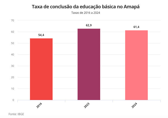 Já no grupo de 15 a 17 anos de idade, no Amapá, 62,0% frequentavam ou concluíram o ensino médio (etapa adequada para esse grupo etário) em 2024, uma queda ante 2023 (66,8%). O indicador permanece muito abaixo da meta de 85% prevista no PNE até 2024.