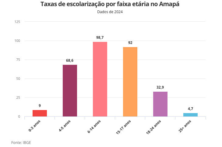 Entre as crianças de 4 a 5 anos, a taxa de escolarização no Amapá foi de 68,6%, com alta ante 2023 (65,2%).