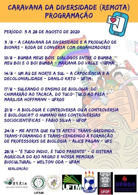 A relação entre o humano e a biodiversidade é tema da Caravana da Diversidade que, nesta edição, vai promover oficinas virtuais e gratuitas entre os dias 3 e 28 de agosto. Uma das propostas é pensar ações conjuntas que investiguem a sociobiodiversidade enquanto conteúdo escolar.