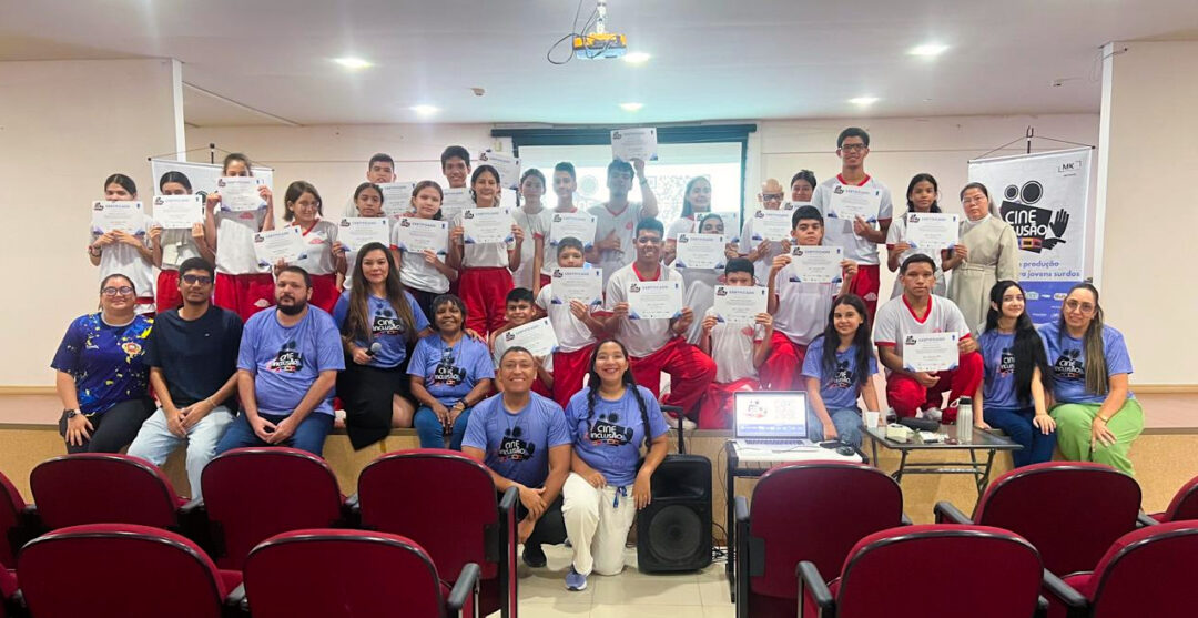 O auditório do Instituto Filippo Smaldone, em Manaus (AM), recebeu uma mostra com os resultados do projeto Cine Inclusão – Surdos em Cena no dia 23 de setembro. Cerca de 150 pessoas prestigiaram o evento, entre alunos e convidados, que contou com a exibição dos quatro curtas-metragens produzidos pelos 31 alunos da oficina, celebrando o encerramento de um ciclo de aprendizado e criação coletiva.