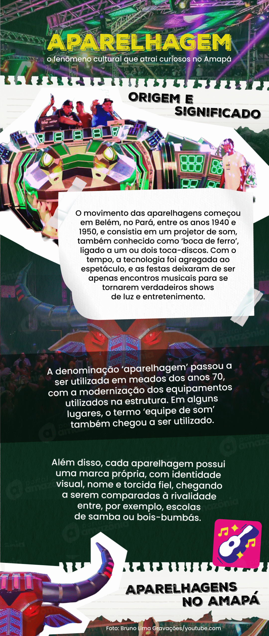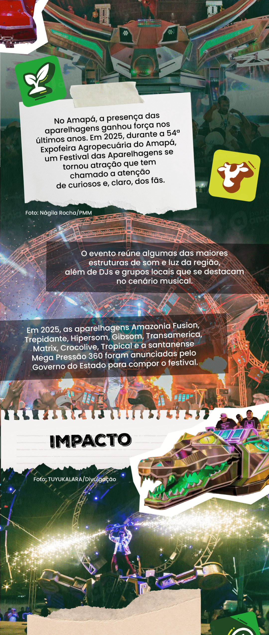 As aparelhagens, fenômeno cultural que nasceu no Pará e rapidamente se expandiu pelo Amapá, são conjuntos de som, luz, efeitos visuais e pirotecnia que animam as festas populares. O fenômeno, ligado a ritmos regionais como brega, tecnobrega e melody, transformou-se em atração cultural que reúne multidões.