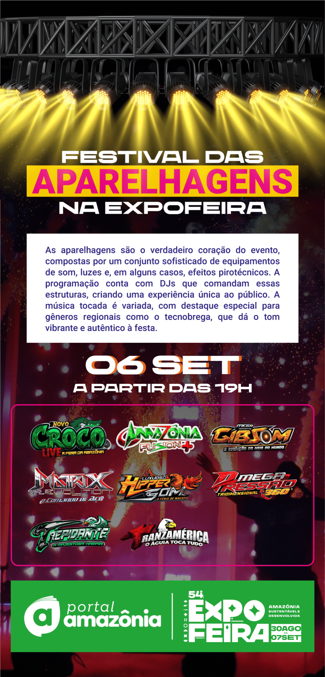 Com sistemas de som potentes, jogos de luz, lasers, painéis de LED e efeitos pirotécnicos, as aparelhagens carregam nome e identidade própria. Na 54ª Expofeira do Amapá as aparelhagens são atrações confirmadas e imperdíveis.