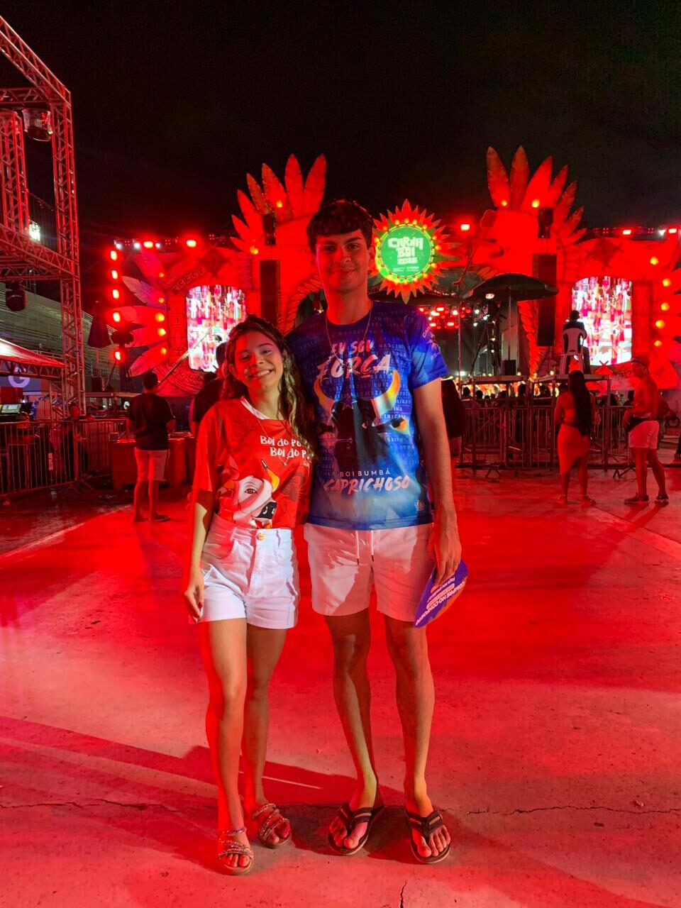 A rivalidade saudável protagonizada pelos bois também foi sentida no público. Milhares de torcedores azulados e vermelhos dançaram juntos os principais hits que marcaram gerações, como foi o caso do casal de amigos Eveny Braga e Gabriel Façanha. Torcedores de bois diferentes, a dupla contou que a paixão pelo boi-bumbá surgiu na infância, por influência dos pais.