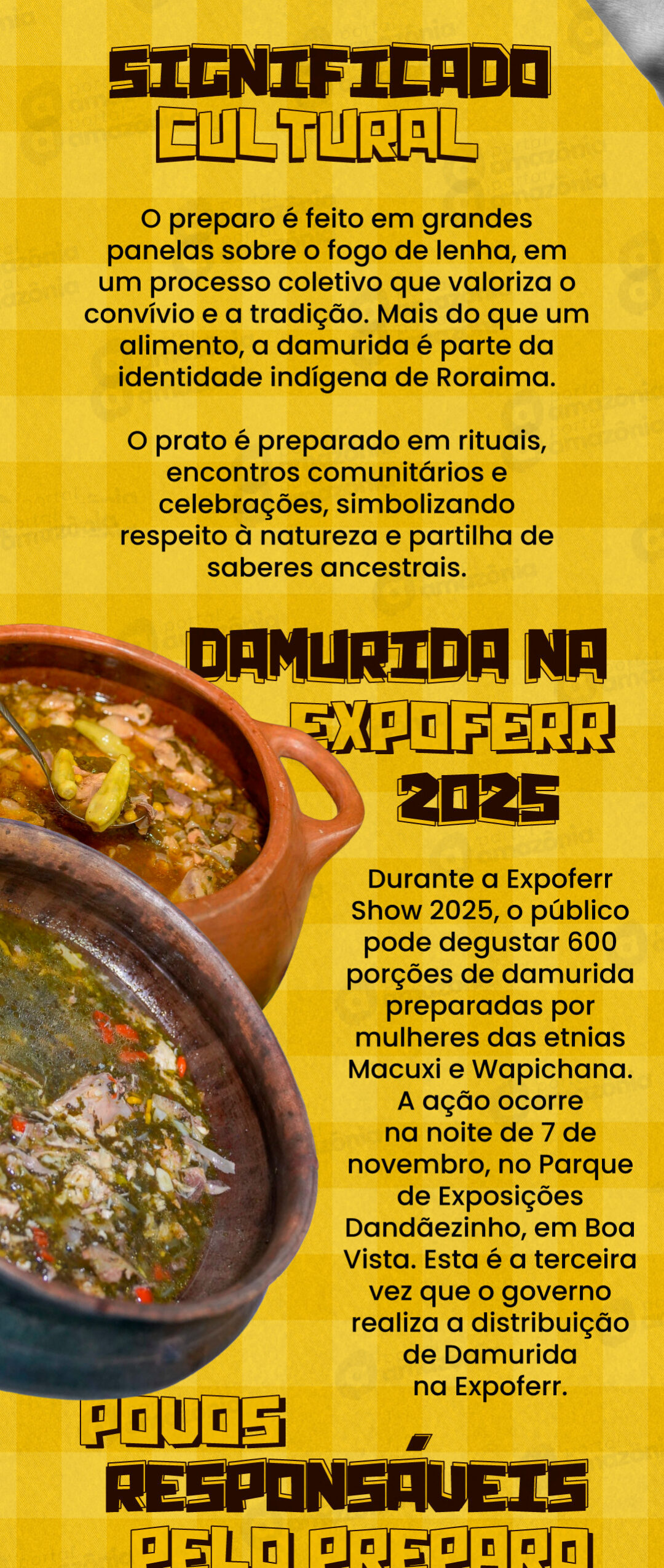 A tradicional damurida, prato típico das etnias Wapichana e Macuxi, é um dos destaques culturais da Expoferr Show 2025, principal feira agropecuária de Roraima. O evento, que ocorre de 4 a 8 de novembro no Parque de Exposições Dandãezinho, em Boa Vista, reúne mais de 300 expositores e espera atrair cerca de 550 mil visitantes durante cinco dias de programação voltada ao agronegócio, tecnologia e cultura regional.