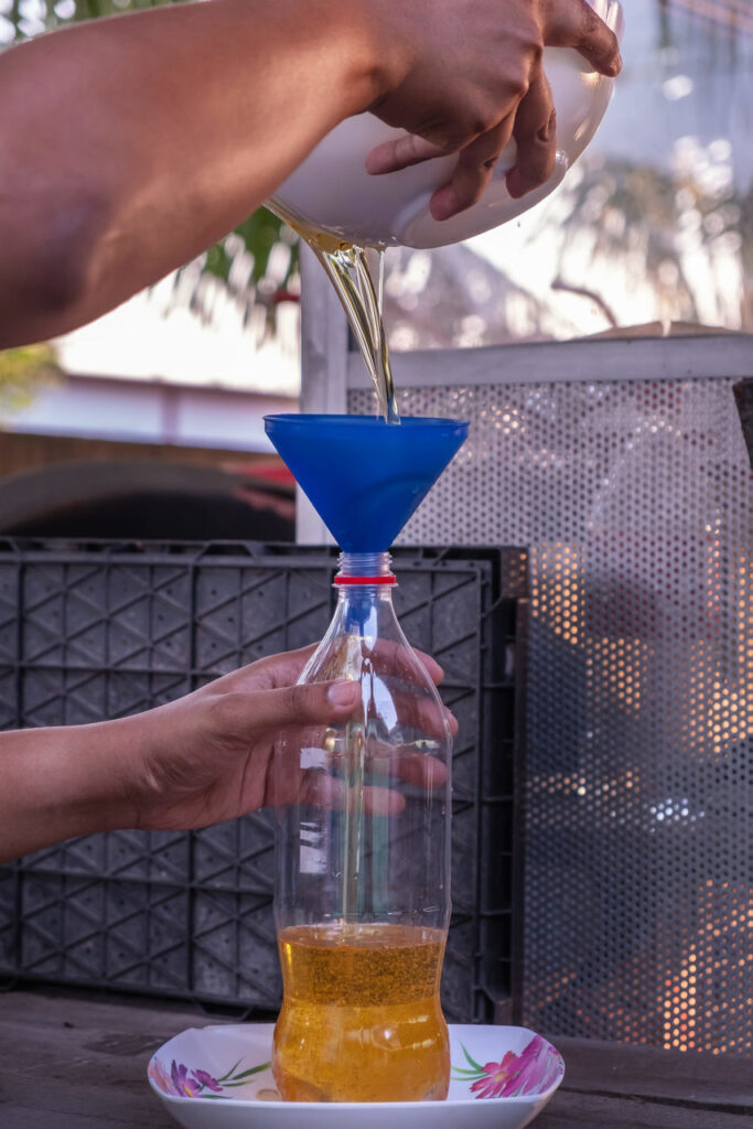 O óleo deve ser guardado somente após esfriar, utilizando um funil para evitar vazamentos. Além disso, não é necessário filtrar o óleo antes de armazenar, e quando um volume significativo for acumulado, basta encaminhá-lo para a coleta especializada.