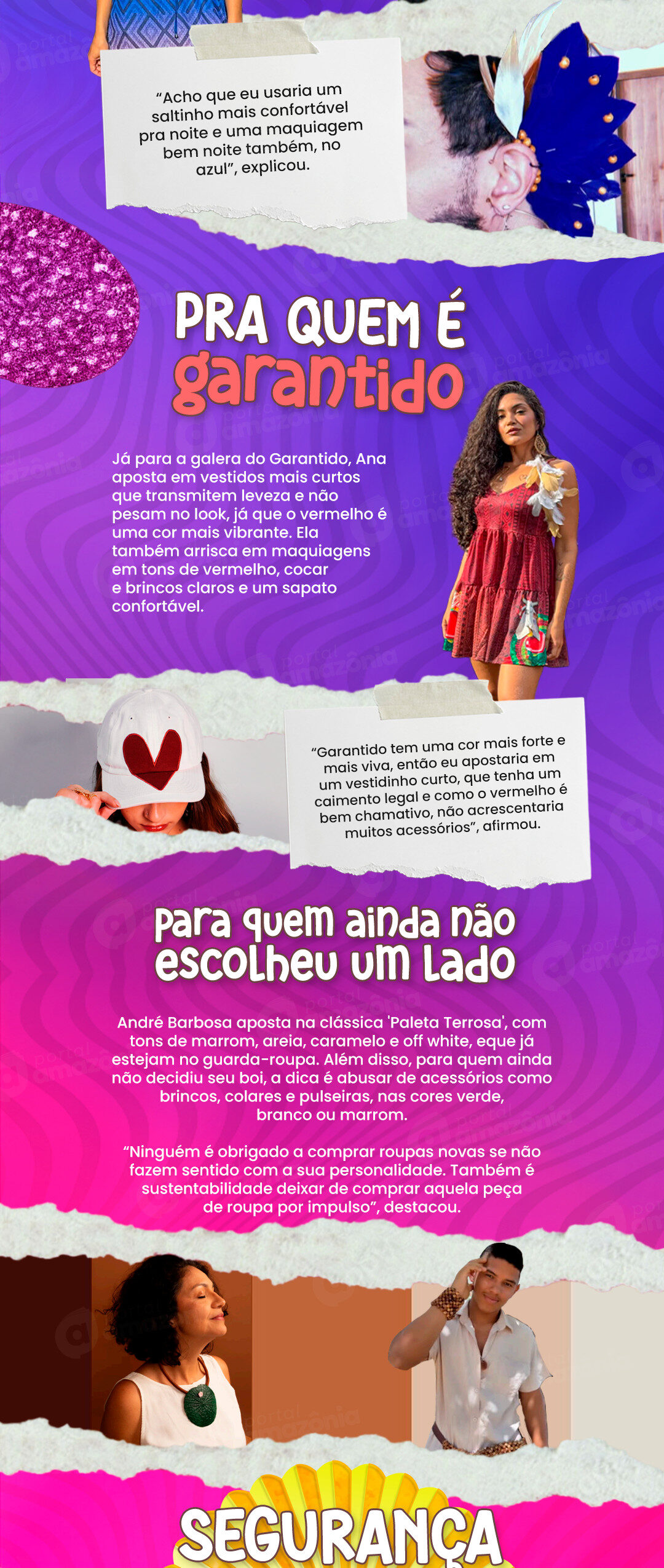 É nessa época que as cores dos bois de Parintins – o azul do Caprichoso e o vermelho do Garantido – passam a ganhar destaque. Os torcedores dos bois garantem looks sempre ligados às cores de seus bois, mas é possível se divertir mesmo que ainda tenha sido escolhido por um deles, com tons neutros e cores coringas.