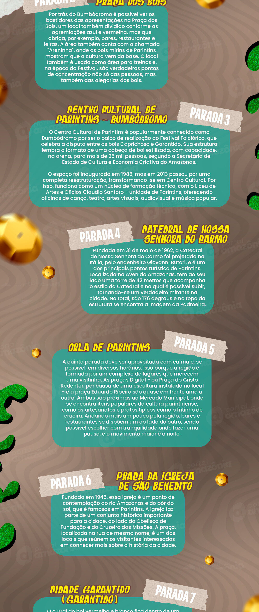 Mas muito além de escolher Parintins para pular com as marchinhas e se divertir neste período, é possível conhecer pontos turísticos e emblemáticos da cidade durante os dias de Carnaval. Confira um mapa que mostra alguns dos pontos mais conhecidos e como é possível conhecê-los até mesmo à pé!