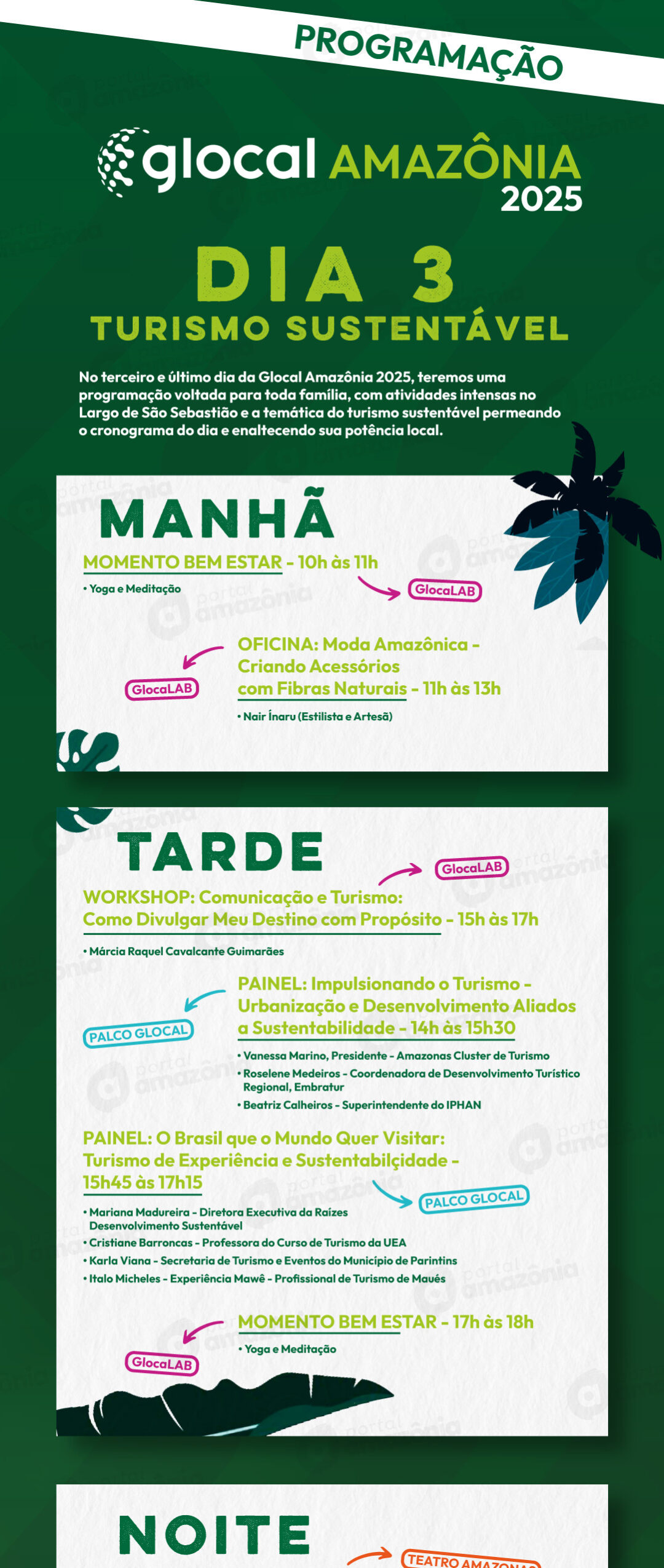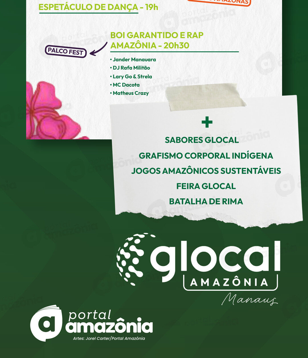 A Glocal Amazônia 2025 encerra neste sábado (30) sua ampla programação de oficinas e debates em Manaus (AM). Além disso, o terceiro dia do evento conta com yoga, oficinas e também a feira, no Largo de São Sebastião, no Centro, e shows musicais com a presença do campeão de 2025 do Festival Folclórico de Parintins, o boi-bumbá Garantido.