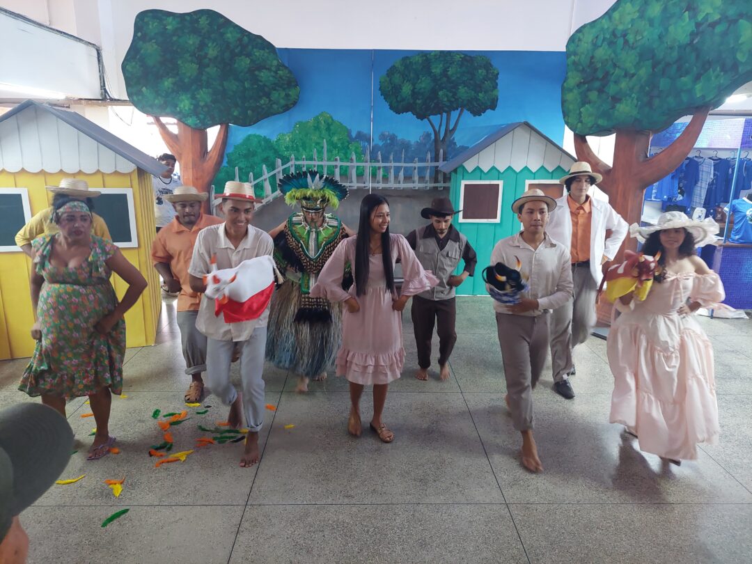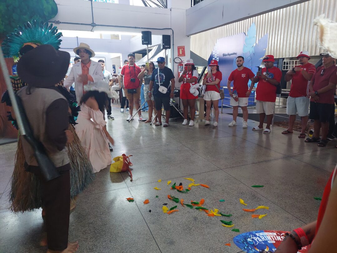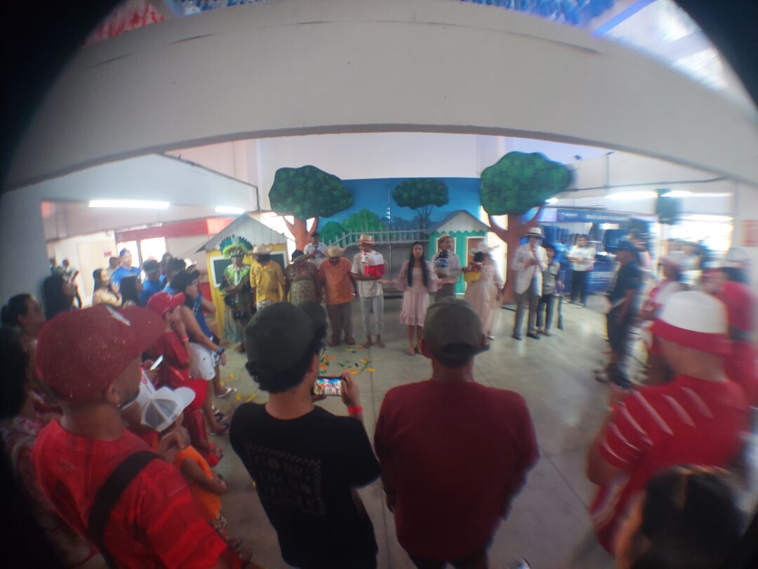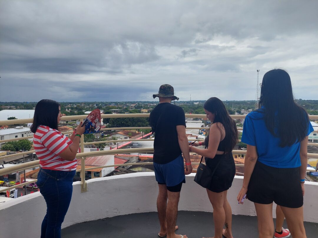 Dos 40, são divididos em grupos de 10 pessoas após assistirem uma breve apresentação teatral, ‘Parintins, Folclore em Festa!’, com os alunos do Núcleo de Teatro do Liceu de Artes e Ofícios Claudio Santoro de Parintins.