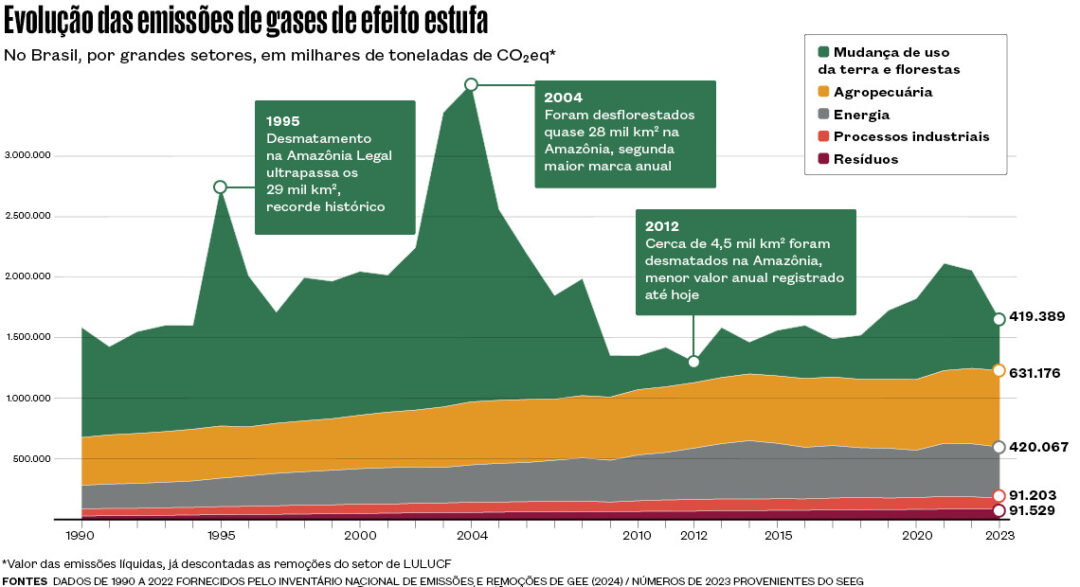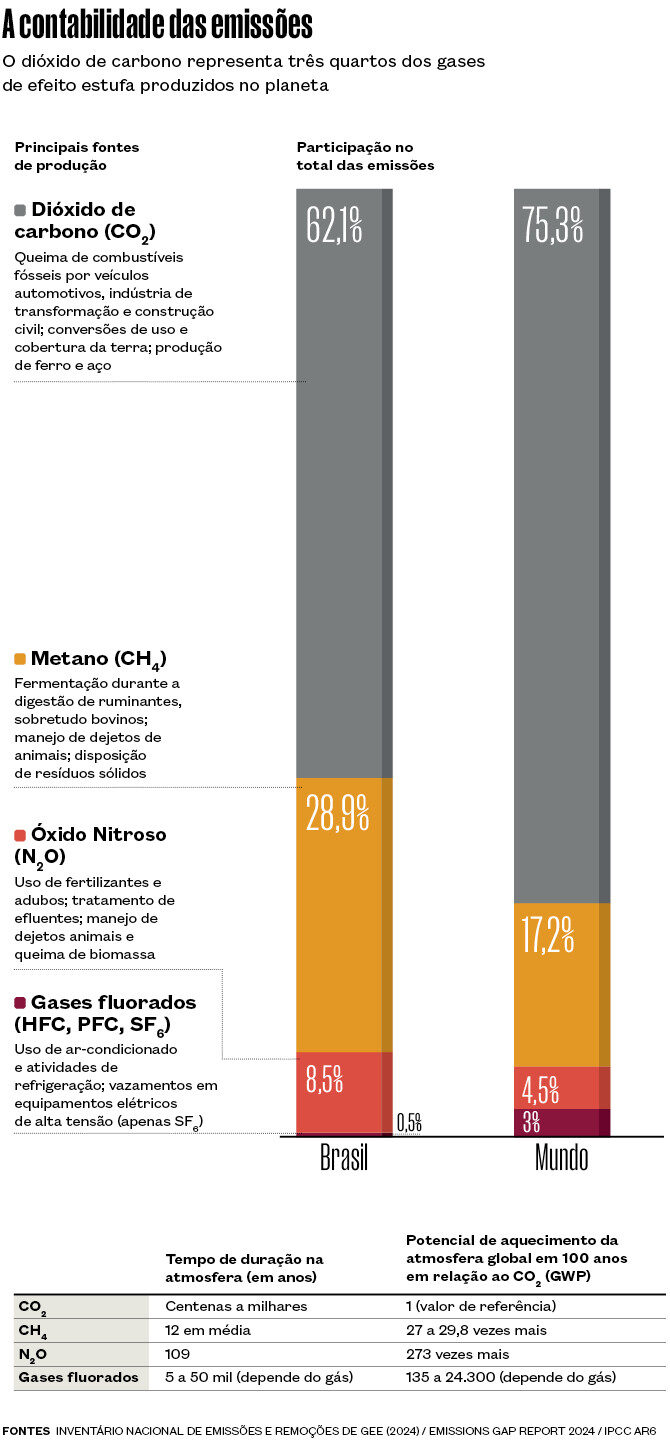 Para onde forem dois fenômenos do Brasil profundo, o corte de florestas nativas e o crescimento da agropecuária, as emissões nacionais de gases de estufa (GEE) também irão. O país tem um perfil bem diferente em relação às grandes economias que mais liberam na atmosfera dióxido de carbono (CO₂), metano (CH₄), óxido nitroso (N₂O) e gases fluorados (como HFC, PFC, SF₆ e NF₃), que representam a quase totalidade dos GEE produzidos no planeta. Esses compostos retêm calor na atmosfera, potencializam o aquecimento global e exercem o papel de combustível das mudanças climáticas.