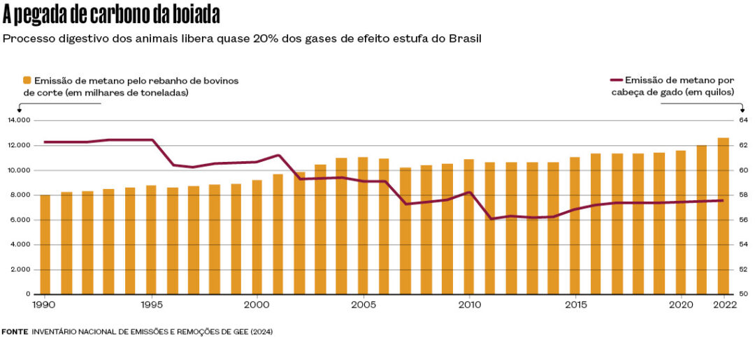 Entre 1990 e 2022, a produção anual de metano por cabeça de bovinos de corte caiu cerca de 8% no país, segundo o inventário nacional. Mas, como a taxa de crescimento do rebanho foi maior do que o ganho de produtividade, as emissões totais geradas pela fermentação entérica continuam em alta (ver gráfico abaixo). “Melhorar a qualidade do pasto diminui a produção de metano pelos bovinos”, pondera Cerri. “Temos ainda muito espaço para avançar nessa área.”