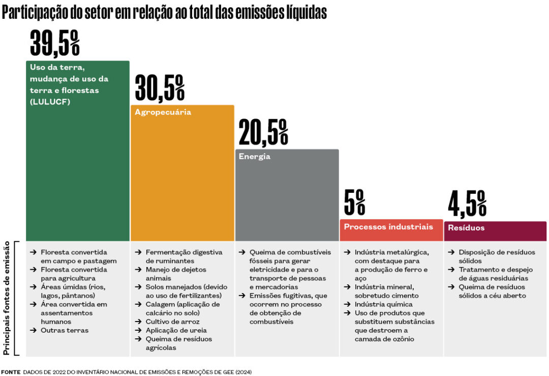 Segundo o mais recente Inventário Nacional de Emissões e Remoções de GEE, divulgado em dezembro de 2024 pelo Ministério da Ciência, Tecnologia e Inovação (MCTI), 39,5% dos GEE emitidos pelo Brasil são em grande parte oriundos da conversão de áreas de vegetação nativa – basicamente florestas – em campos, pastagens e terras para lavoura. Outros 30,5% advêm da agropecuária, sobretudo da criação de bovinos (quase 20% do total) e do manejo de solos (7%).