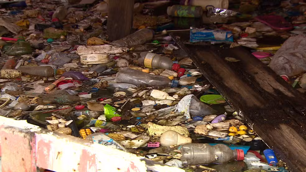 O lixo que se espalha com a enchente agrava a situação. Garrafas, entulho e restos de móveis boiam entre as casas. Com o acesso dificultado, a coleta é prejudicada e o descarte irregular se intensifica.