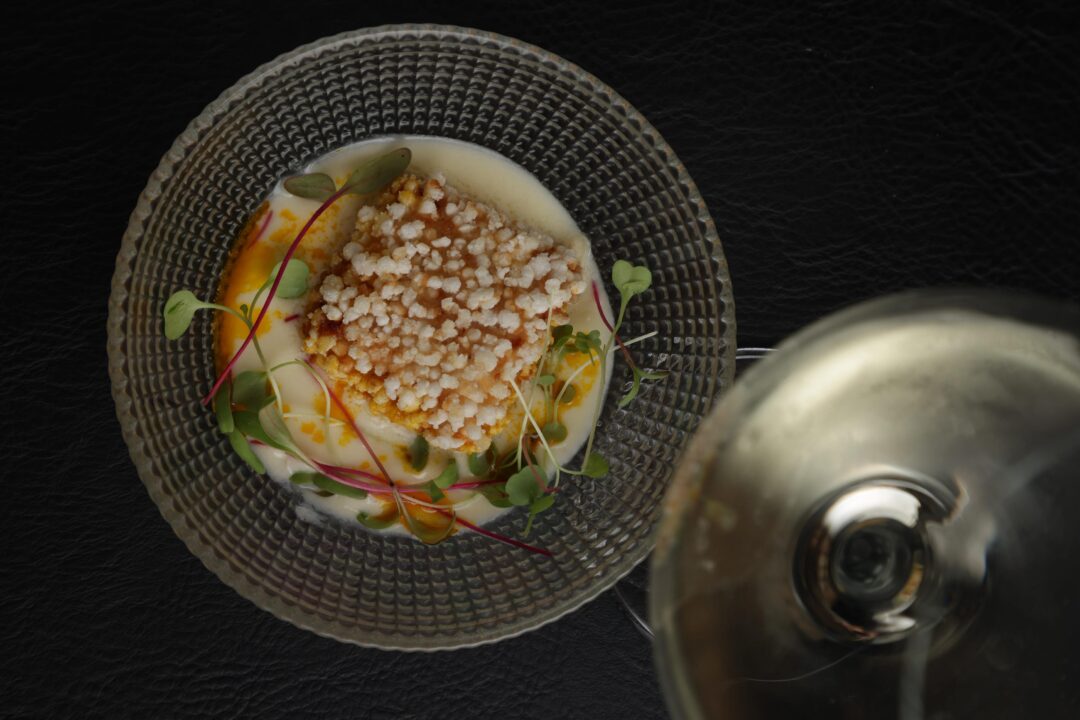 - Barriga na lata: Ventrecha confitada na banha de porco, vinagrete de feijão manteiguinha, mousseline de banana pacovã com puxuri e chaya crispy.