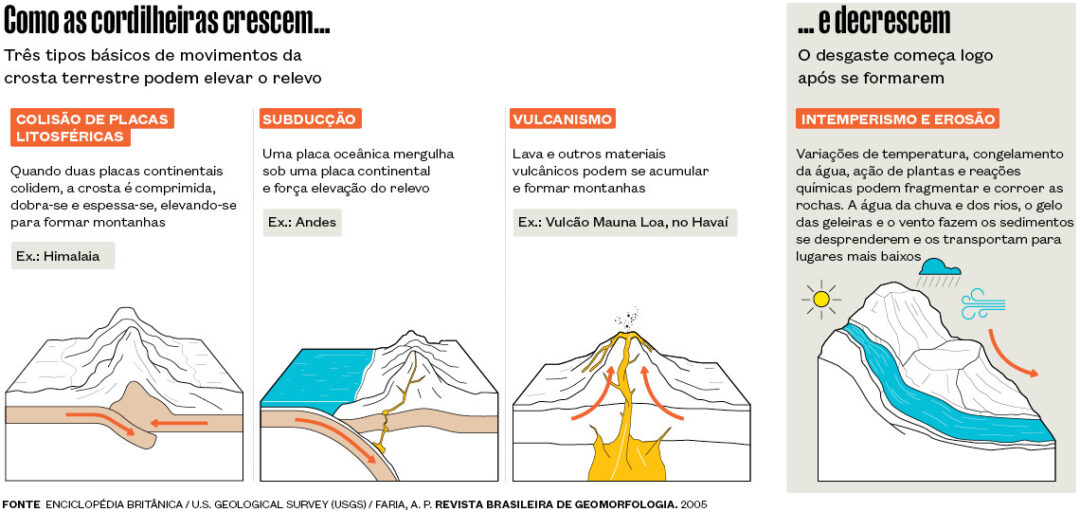 “As montanhas jovens como os Andes, os Alpes e o Himalaia, que começaram a se formar entre 120 milhões e 50 milhões de anos atrás, estão associadas a áreas de convergência de placas”, comenta o geólogo Celso Dal Ré Carneiro, da Universidade Estadual de Campinas (Unicamp), que participou da redefinição dos conceitos do relevo brasileiro.