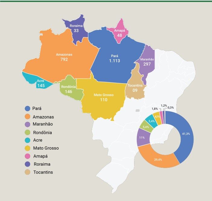 Os estados do Amazonas, Acre e Rondônia tiveram 100% dos municípios mapeados, seguidos por Pará (66,7%), Amapá (50%), Maranhão (41,4%), Roraima (33,3%), Mato Grosso (15,6%) e Tocantins (10,7%).
