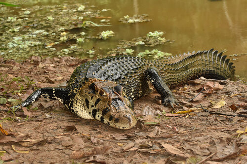 O jacaré-açu, maior réptil da América do Sul, pode chegar a mais de 5 metros de comprimento. O animal é um predador imponente que regula populações de peixes e outros animais aquáticos.