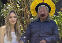 Cacique Raoni recebe a atriz Angelina Jolie em terra indígena no Xingu, em Mato Grosso