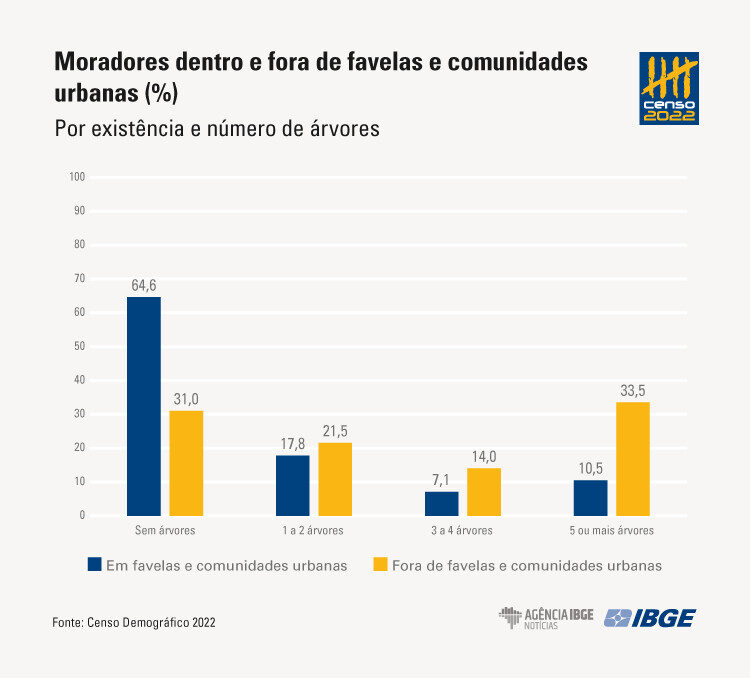 A diferença é grande também quando analisados trechos com 5 árvores ou mais: 10,5% dos moradores de favelas e comunidades urbanas viviam em vias com essa arborização, enquanto 33,5% dos moradores de fora de favelas e comunidades urbanas viviam em ambientes com essa característica.